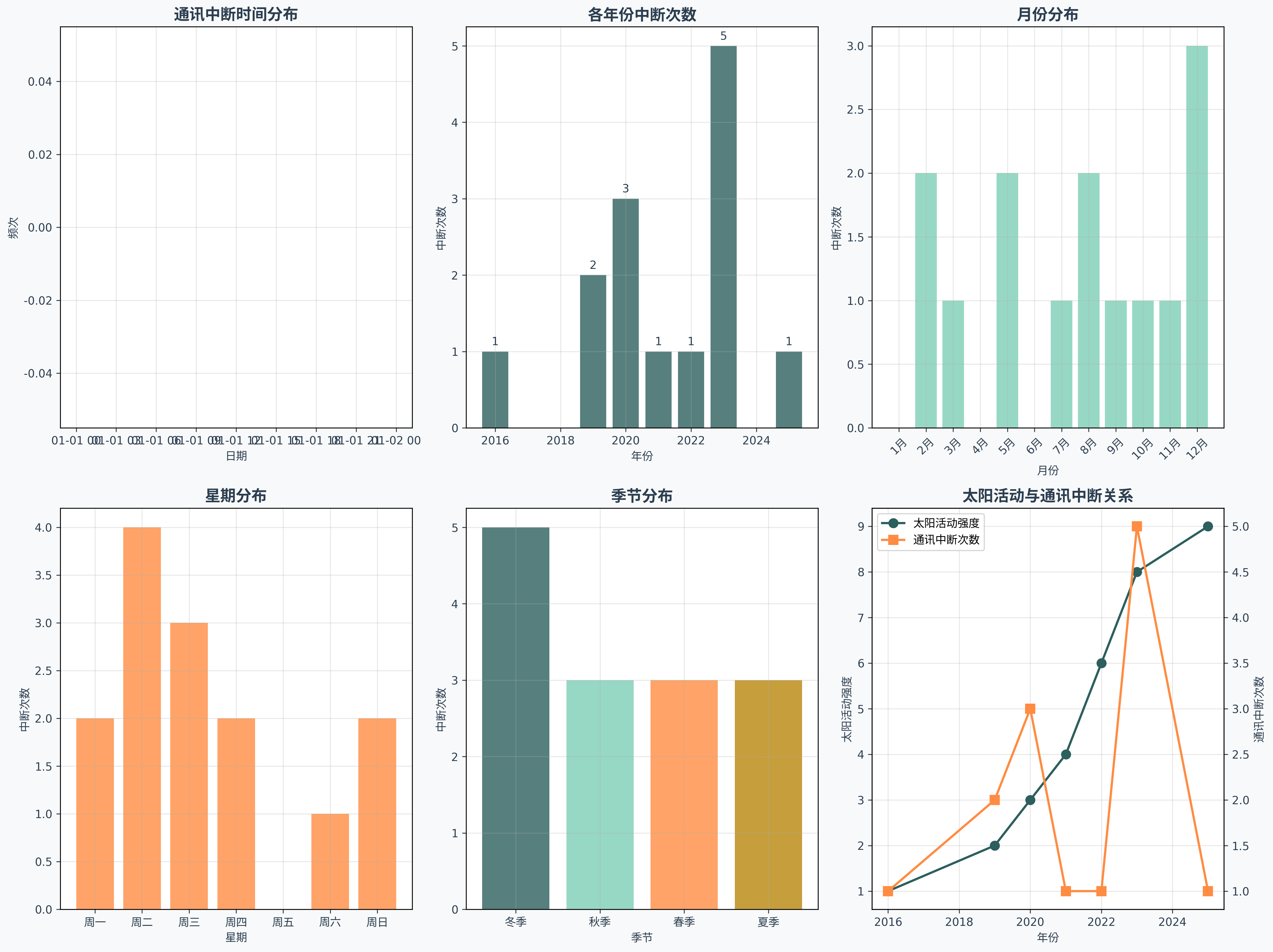 - 季节性特征:冬季通讯中断事件最多(5次),与太阳活动季节性变化相关